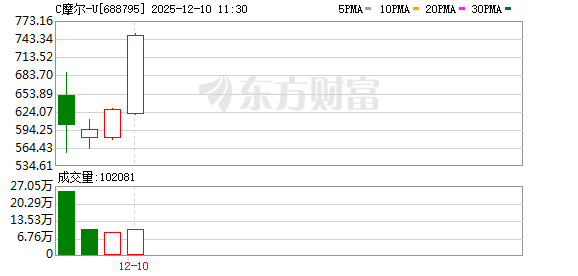 红星老本局12月10日音书,本日早盘,摩尔线程(688795.SH)盘中拉升,截止发稿,涨超16%,报733.71元/股,股价冲破上市首日的688元高点,总市值超3400亿元。